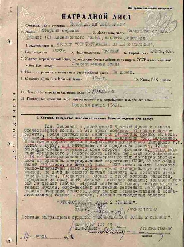 12.06.1945 гв. старшина 31 бап Тимошкин был награжден вторым орденом Отечественной войны II степени, в наградном листе перечислены его боевые вылеты, совершённые после предыдущего награждения: «43 ночных боевых вылета. 1 на бомбардирование столицы Германии г. Берлин, 10 – военно-промышленных объектов на территории Восточной Пруссии, 42 – передового края противника. Является одним из лучших радистов».
